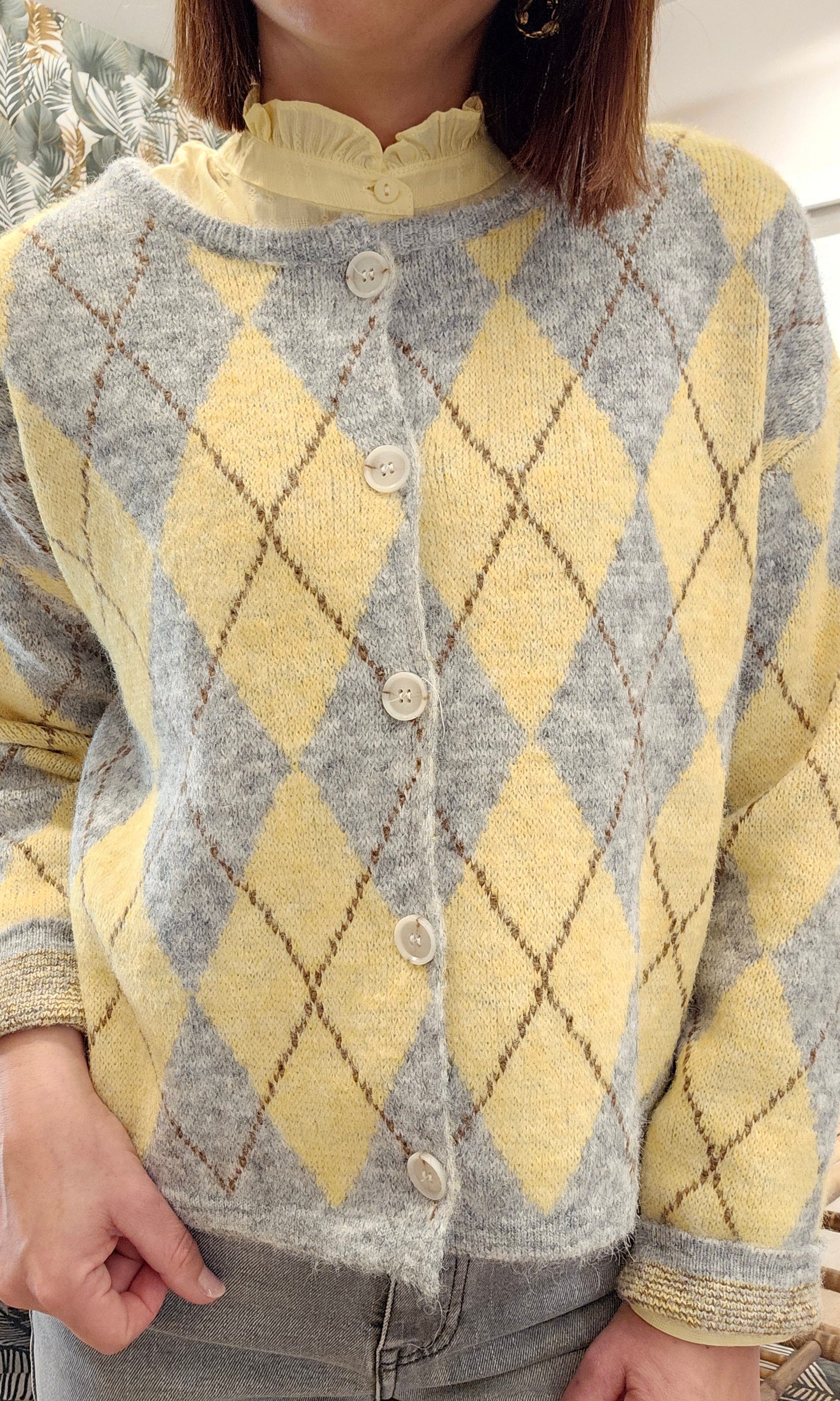 Gilet/Pull à motifs losanges jaune/gris/marron