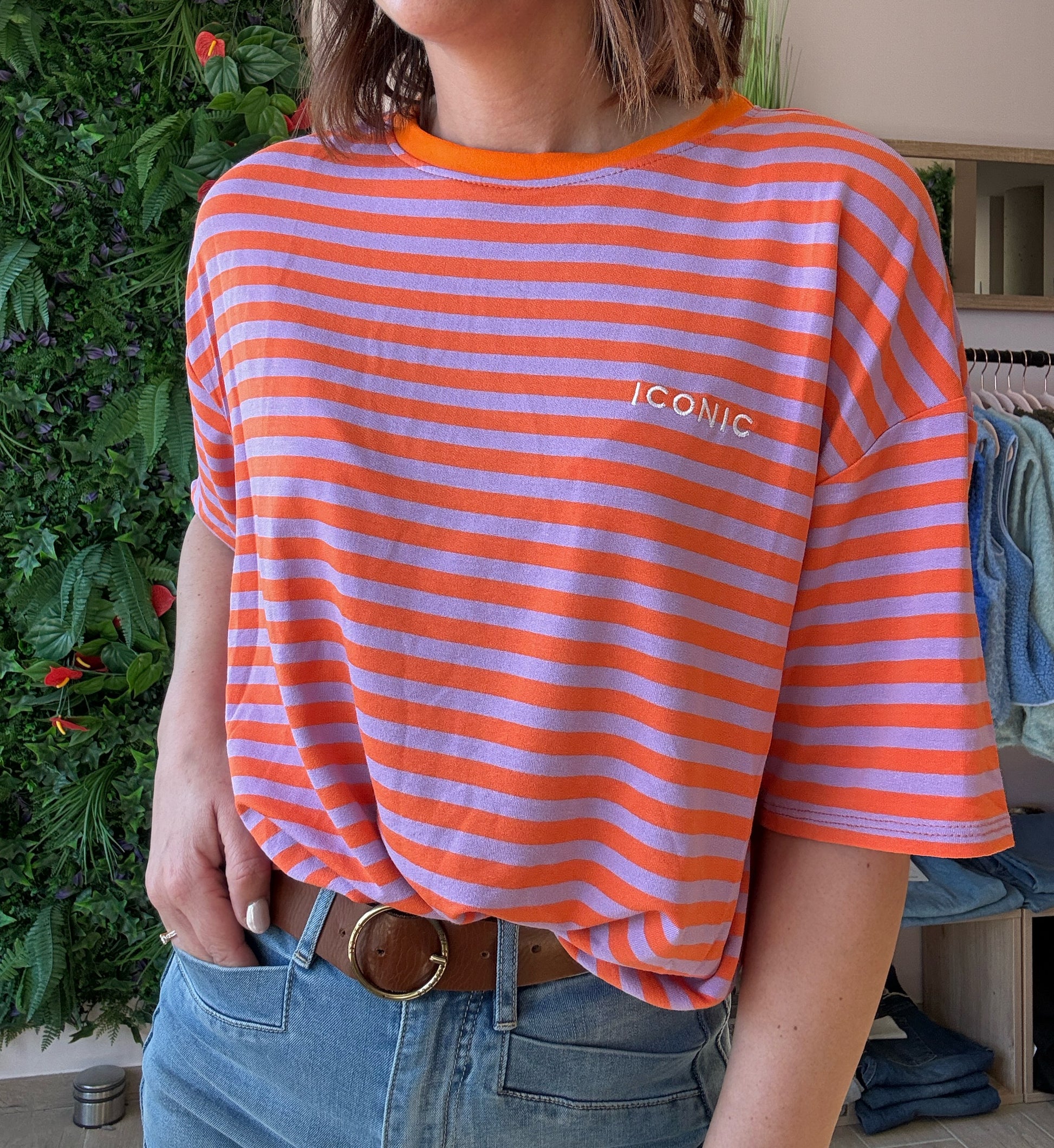 Tee shirt à rayures Orange, avec inscription ICONIC devant